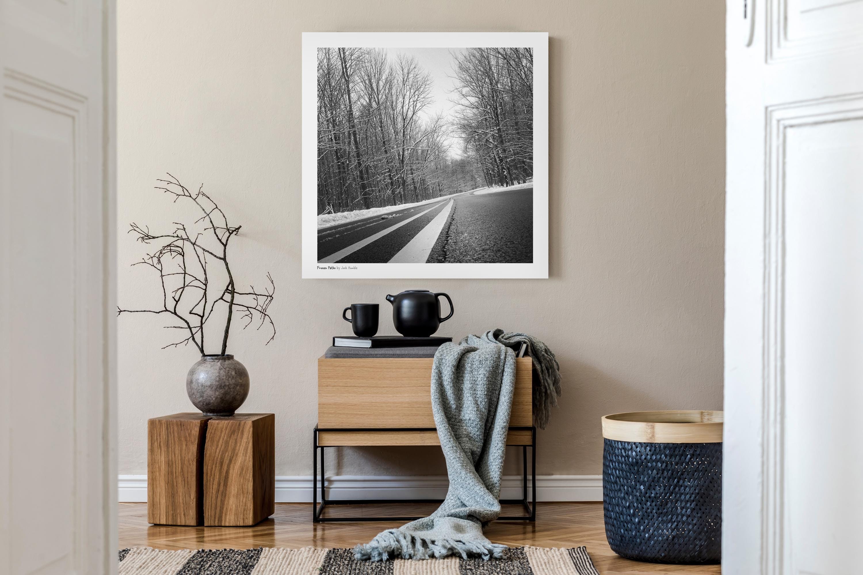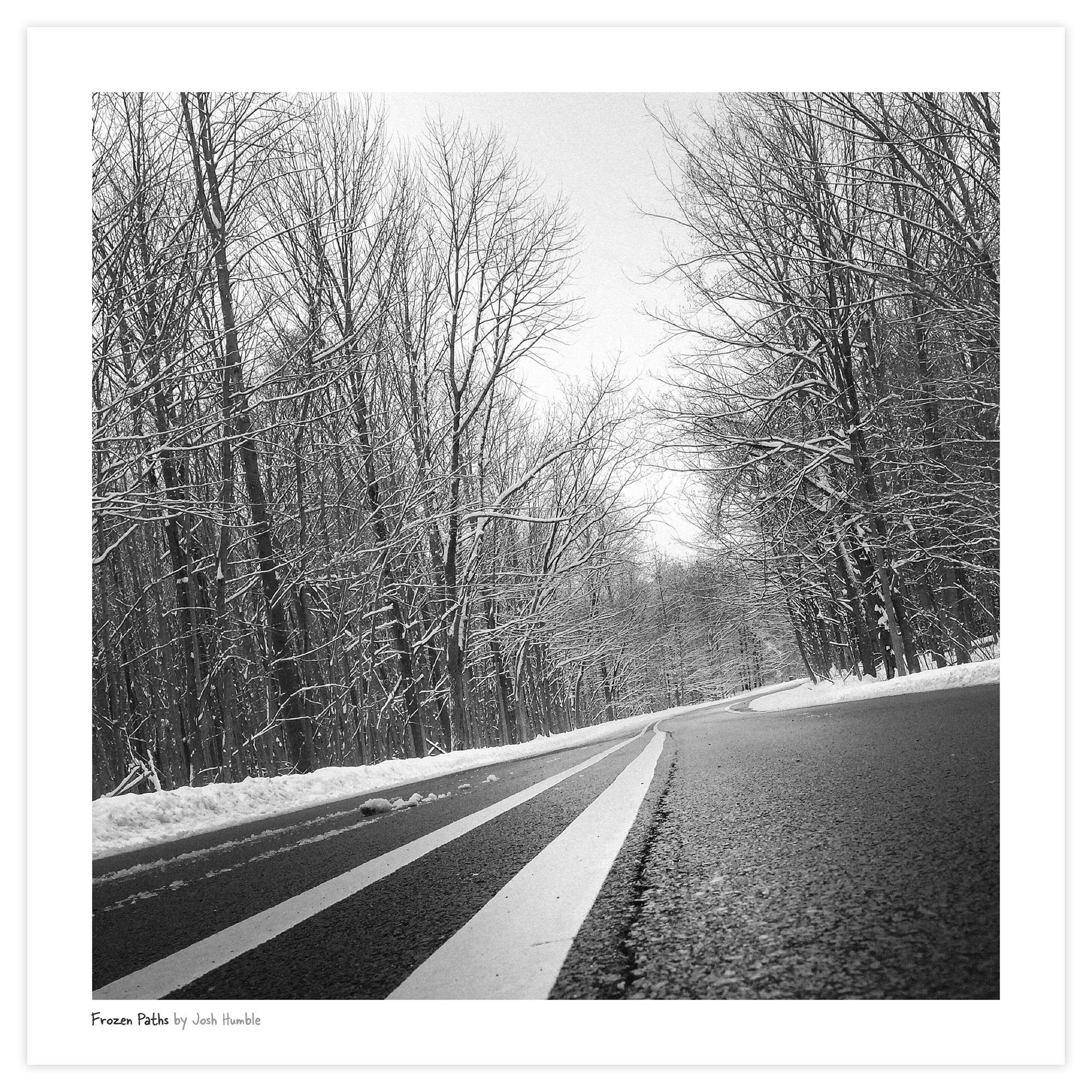 From a series of winter images I captured with an early phone. Photoshop and Snapseed were used for contrast and levels adjustment, monochrome conversion. Photographed in Indianapolis, Indiana. Print comes with a white border and title, artist credit.