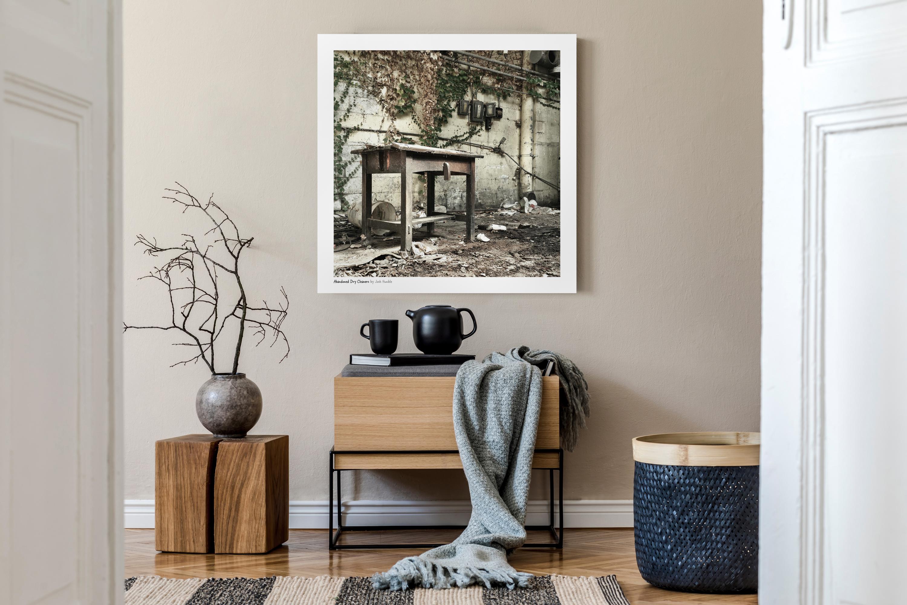 An abandoned dry cleaner in Indianapolis - the building is no longer standing, but I photographed this several years ago with an earlier, lower-res phone, processed with Snapseed. This was just before an avant-garde fashion shoot I modeled for. Photographed in Indianapolis, Indiana. Print comes with a white border and title, artist credit.