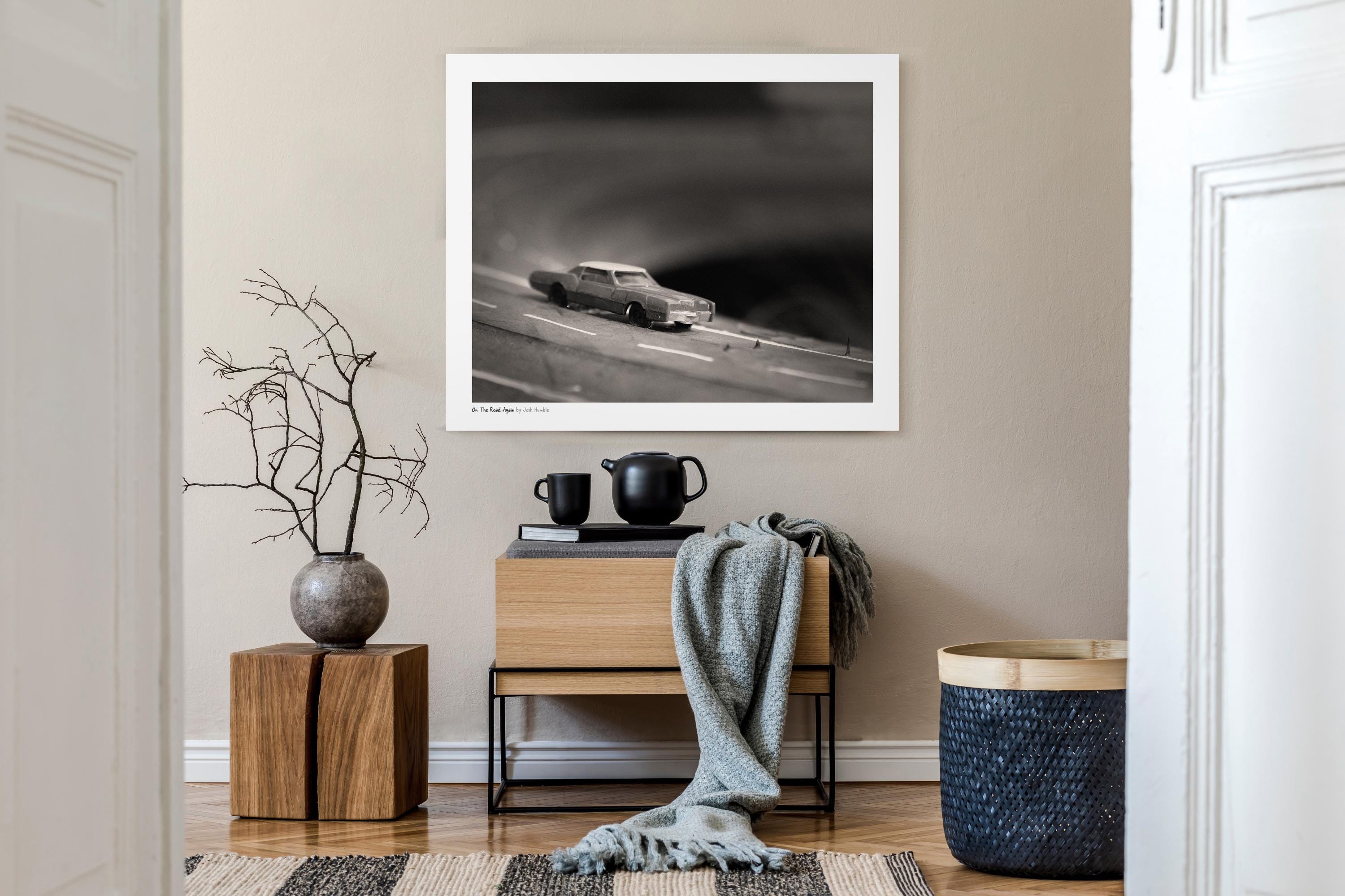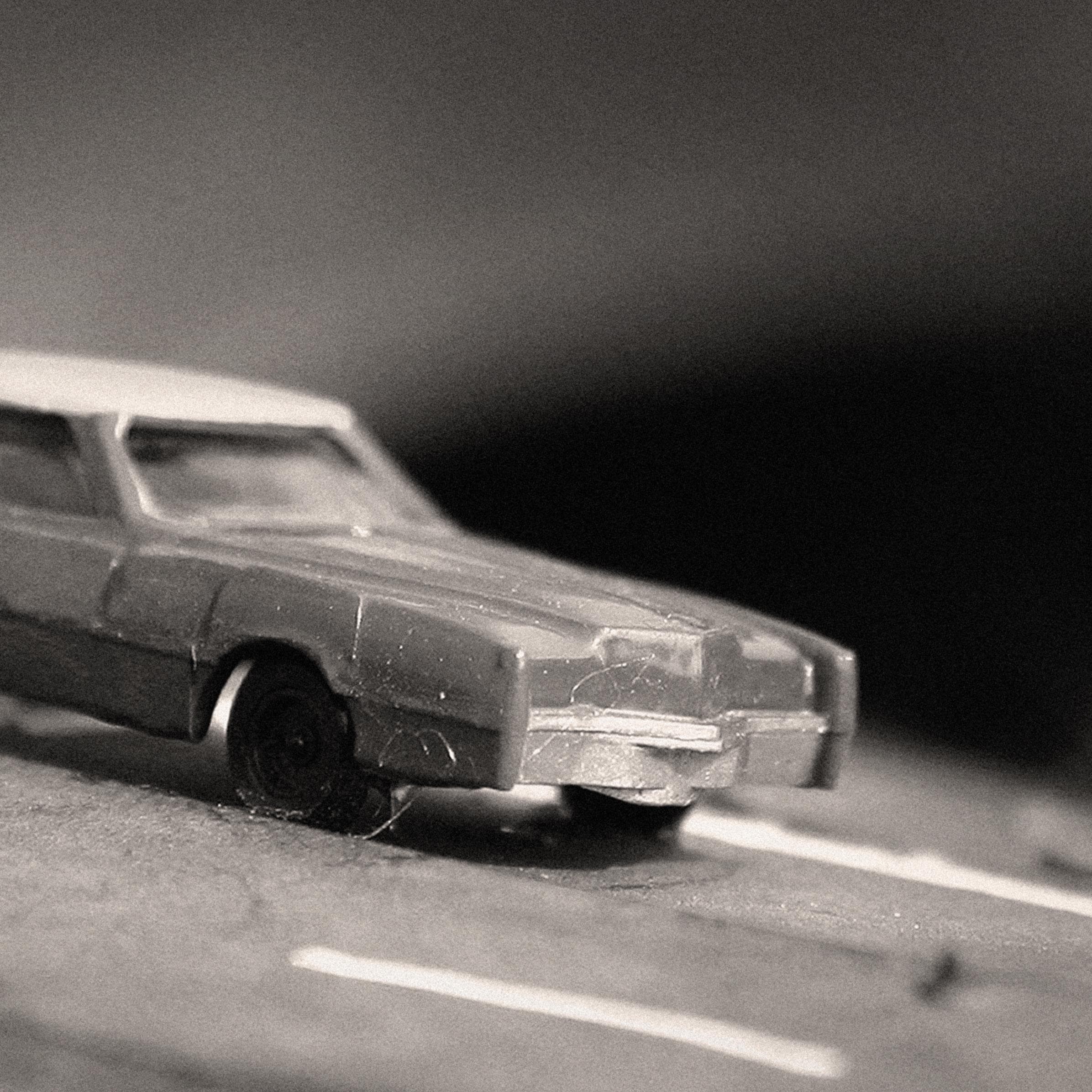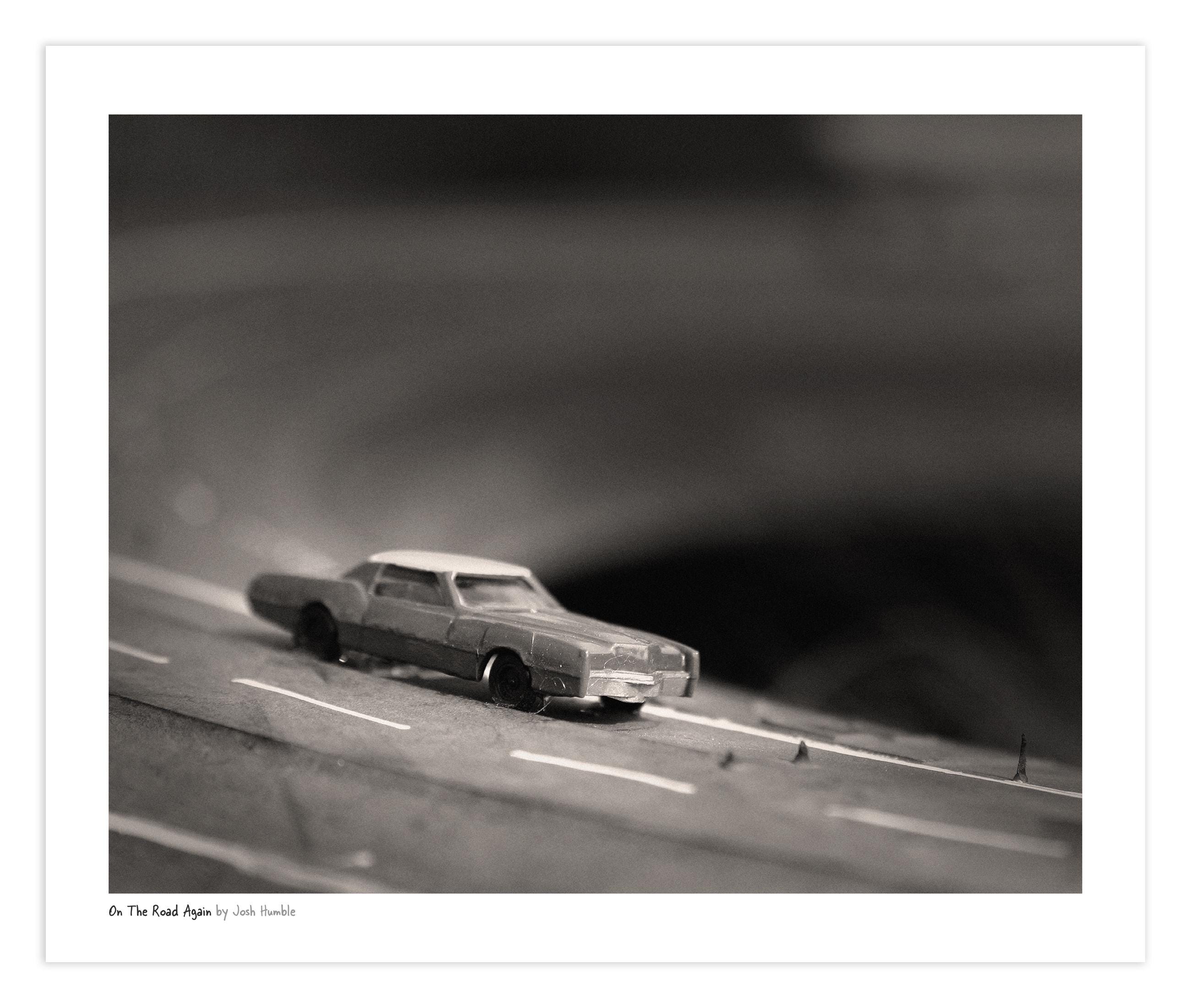 Miniature toy car art found years ago in Downtown Indianapolis' art district. The car was among several carefully placed on a large tire. Print comes with a white border and title, artist credit.